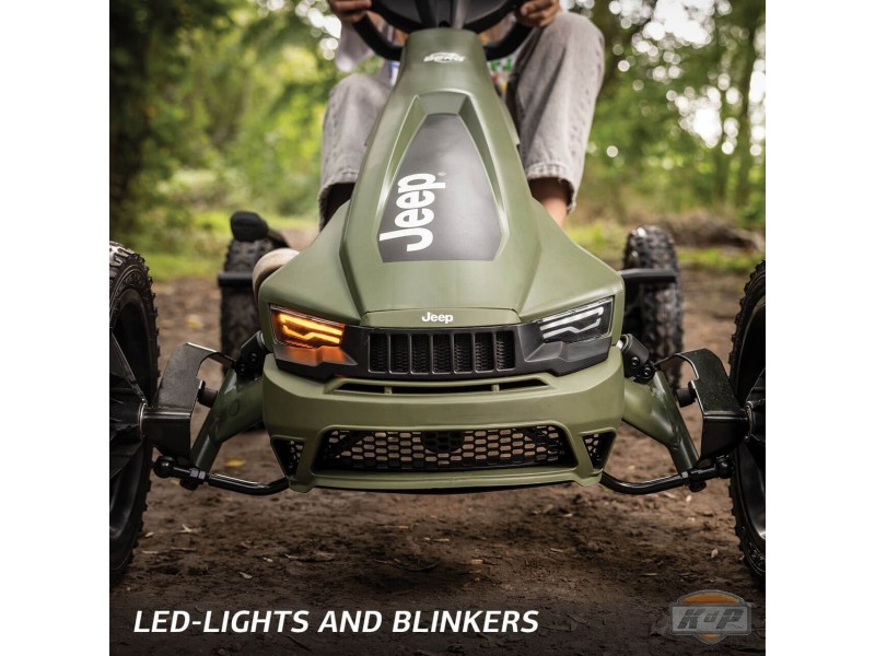 Este Cherokee Berg Toys tiene neumáticos todoterreno. Nadie te podrá parar, viene equipado con luces e intermitentes